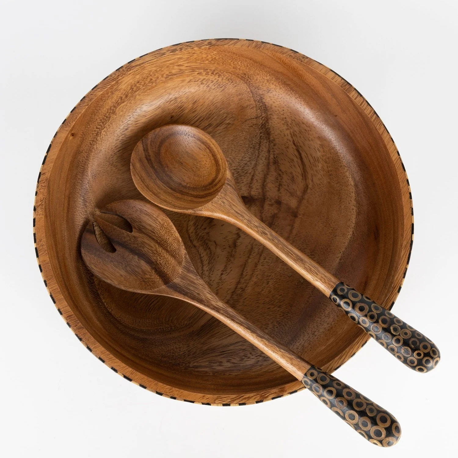 Nothing says togetherness like a shared meal. With the Gather Round Salad Servers, your tablescape will be both elegant and ethical! Handcrafted in Indonesia of suar wood and black bamboo, these salad servers come in shades of natural brown and black with a black bamboo inlay around the ends of the handles that feature a design of rows of circles.