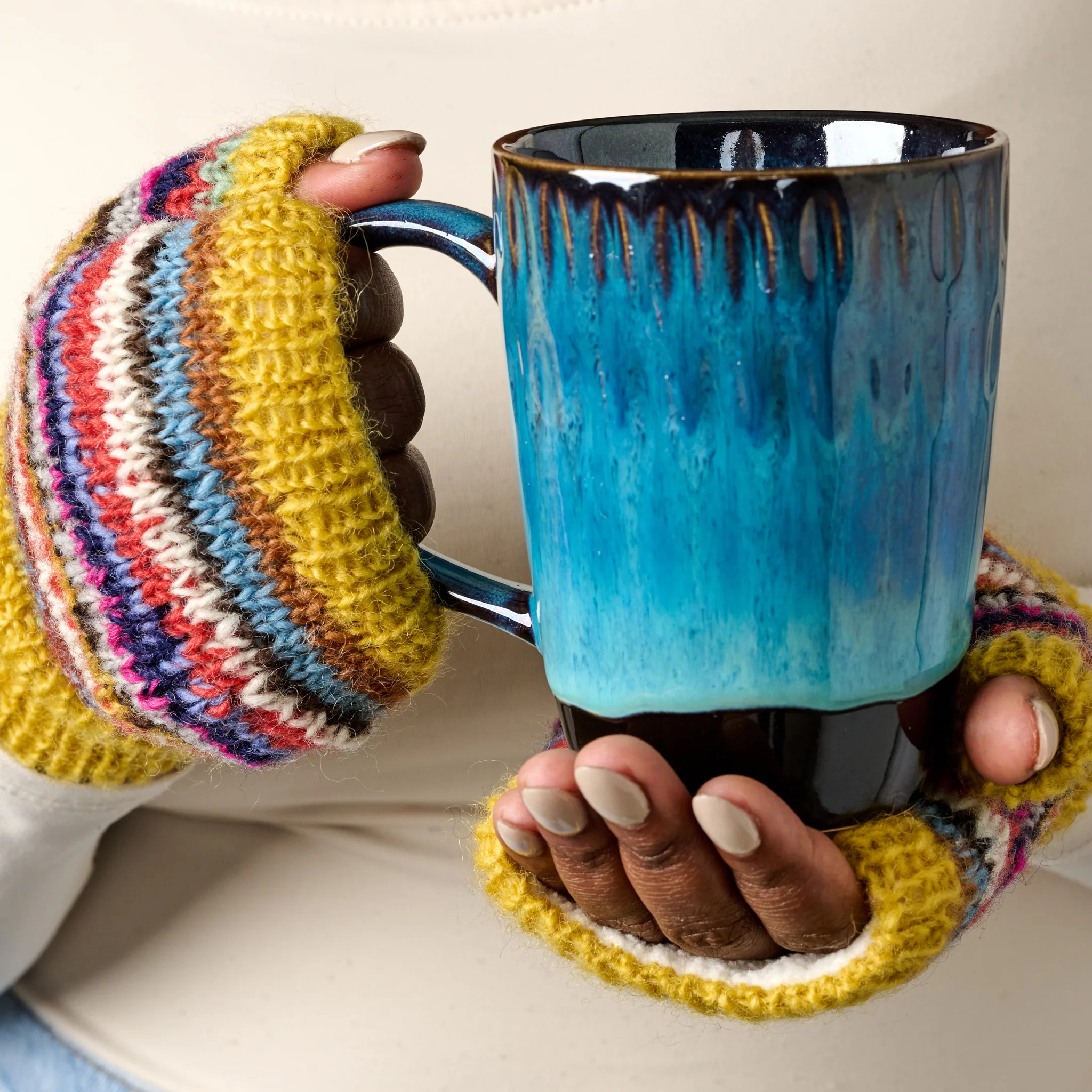 These knit wrist warmers are both merry and bright! Handcrafted from 100% wool, vivid stripes make a fun winter statement. The inside is lined with fleece, keeping hands and wrists extra toasty while fingers stay free for comfort. Made with love and care by artisans in Nepal. Striped design may vary.