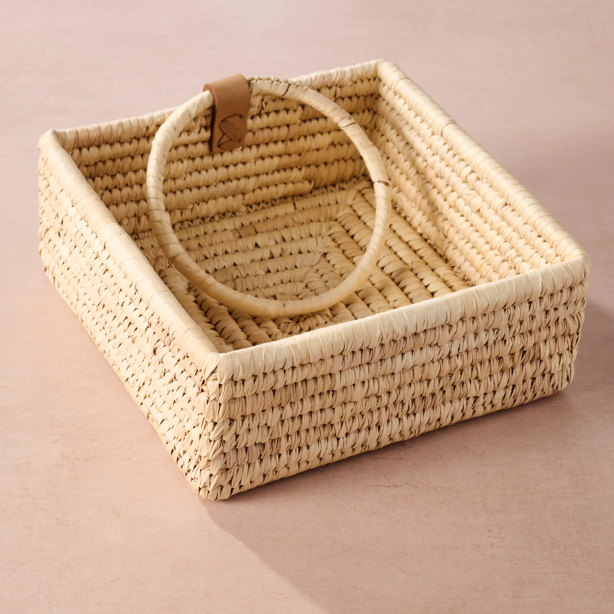 Get your dining or buffet table organized and keep your napkins neatly in place with this awesome napkin basket! Made from durable date leaf, this basket features a weighted iron ring and leather strap for secure napkin placement. A convenient and attractive must-have for any dinner or party host! A Ten Thousand Villages Exclusive handcrafted in Bangladesh.