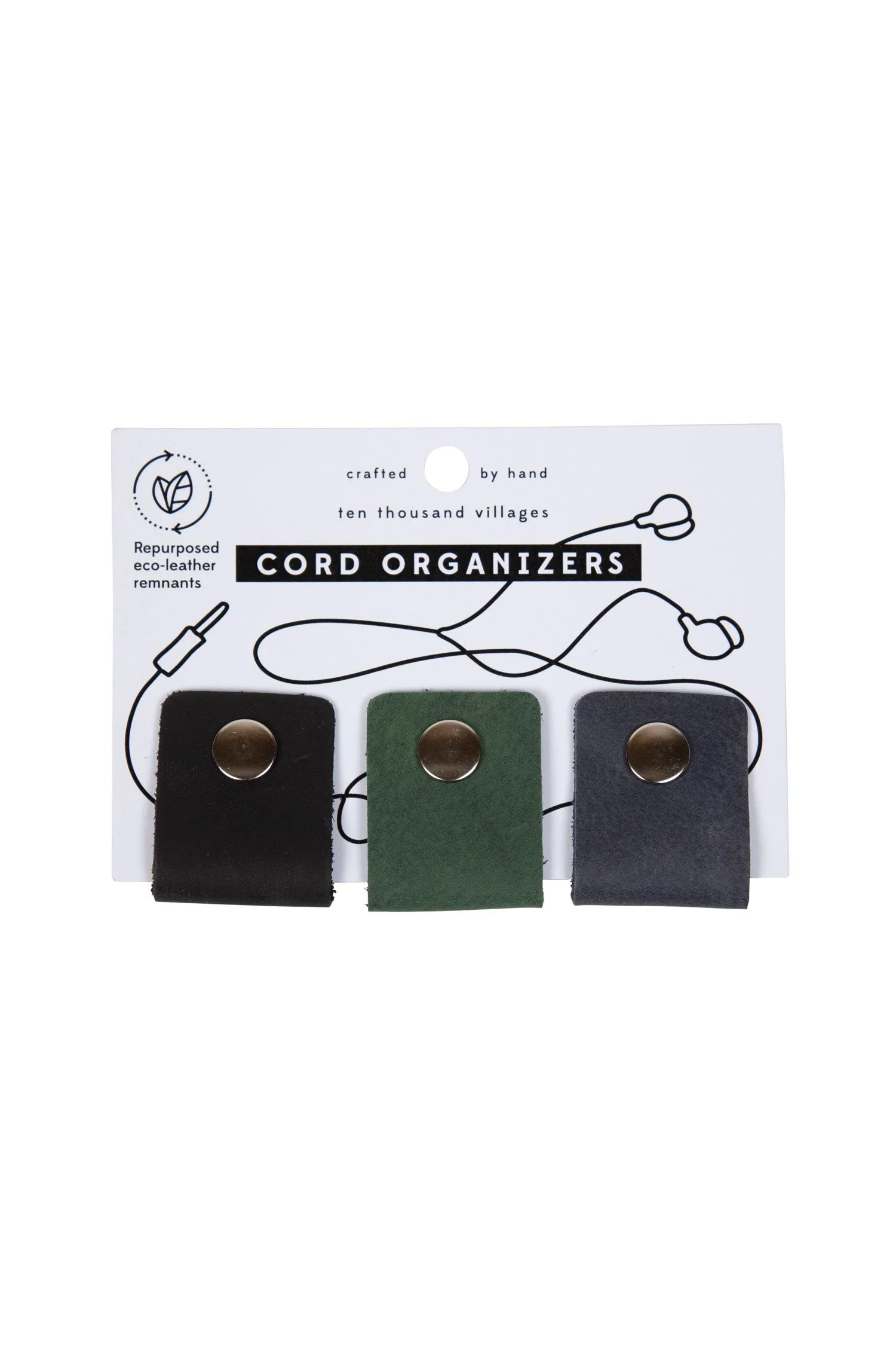 An organized space is a happy space. Get your cords in order with the Leather Cord Organizers from India. Eco-leather is crafted without using hazardous chemicals in the tanning process. Instead of azo dyes, formaldehyde and other substances, eco-leather is tanned using materials derived from sustainable tea bark extracts and waxes. This "vegetable tanning" was used in India in ancient times to tan leather. From our artisan partner group CRC Exports in India, which helps small, informally organized craft workshops develop into self-sustaining businesses.