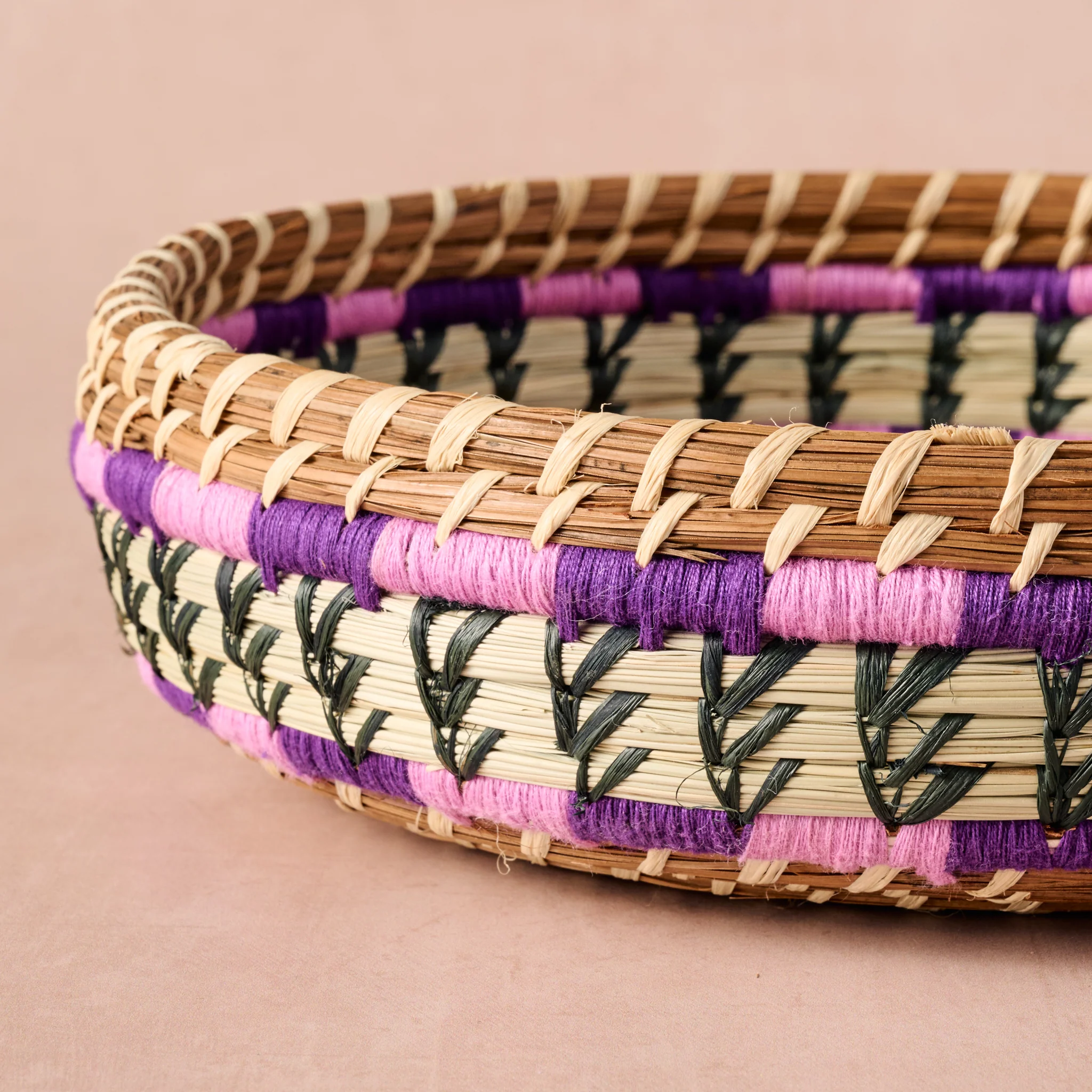 Add natural beauty and meaningful craftsmanship to your space with this stunning handwoven basket. Artisans in Guatemala carefully coil and stitch pine needles and pajón - wild grass - into a mesmerizing swirl of green, dark brown and light brown. Accented with three delicate rings of alternating light and dark purple thread, the basket showcases intricate handwork and rich, earthy tones. Durable, functional and decorative, it’s a gorgeous statement of sustainable artistry that has endless uses. Handcrafted in Guatemala. Coordinates with PN-CO, PN-TRV.