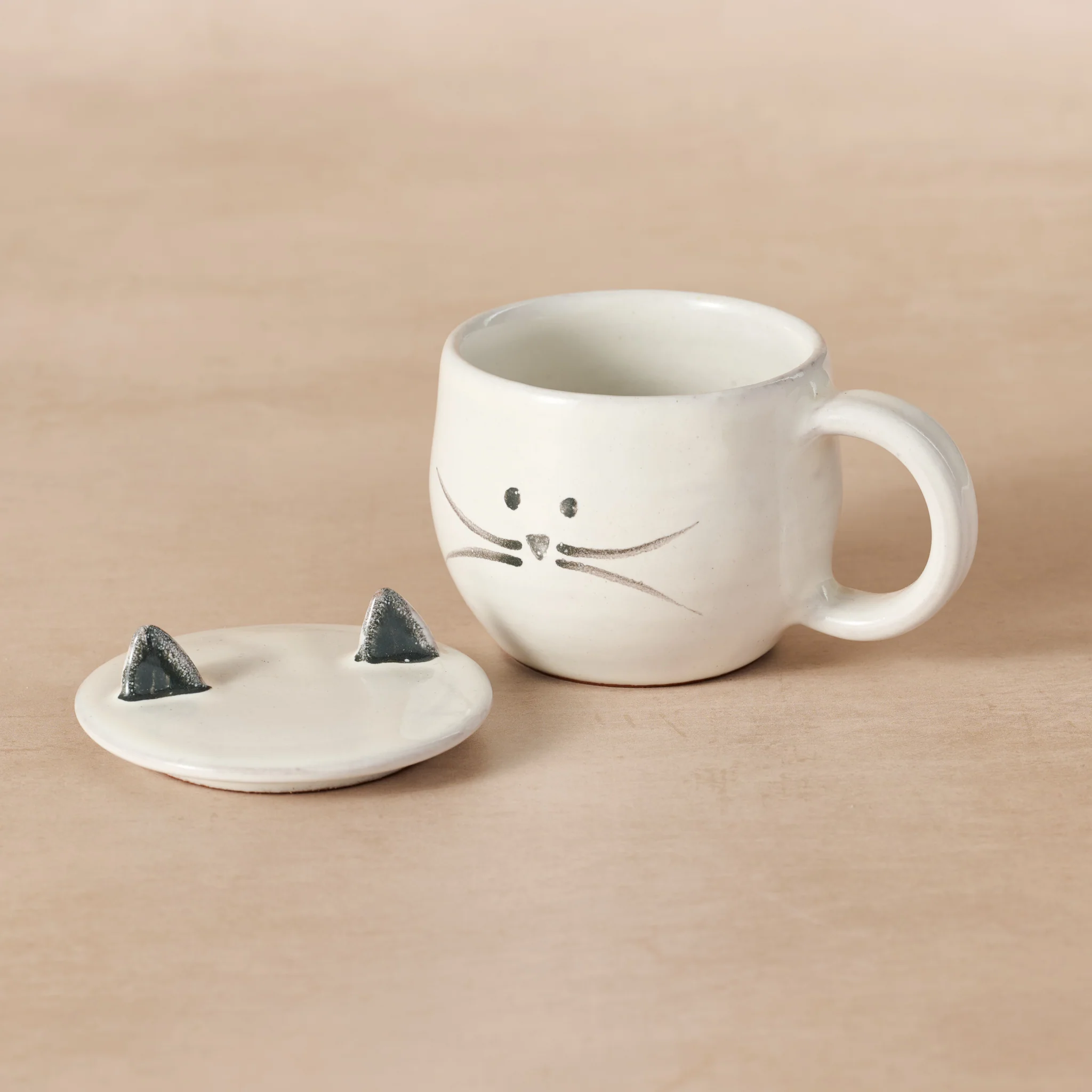 The Meow Mug is an engobe ceramic piece featuring a removable lid with kitty ears for steeping tea and a meowy cute cat face on the front. Handcrafted by fair trade artisans in Nepal.