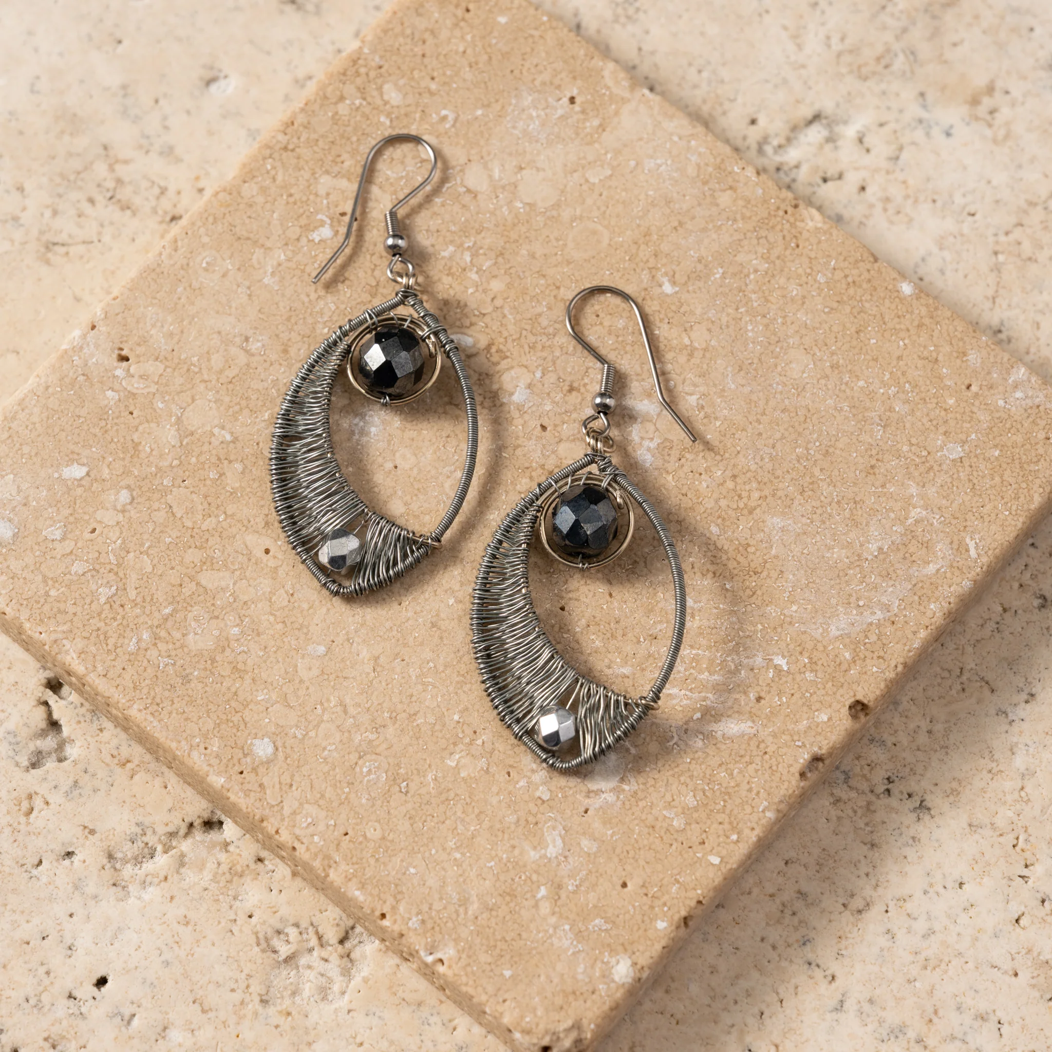 Silver-colored galvanized wire is meticulously wrapped around an elegant elliptical frame, while a central wire creates a graceful half-moon silhouette. Accented with shimmering glass beads with one nested at the base and another suspended at the top; these earrings catch the light with every movement. Finished with durable stainless steel French hooks. A Ten Thousand Villages Exclusive handcrafted in Guatemala by the artisans of Creaciones Chonita, an organization that contributes to the integral development of Guatemalan society by promoting equity and providing employment to the neediest families.