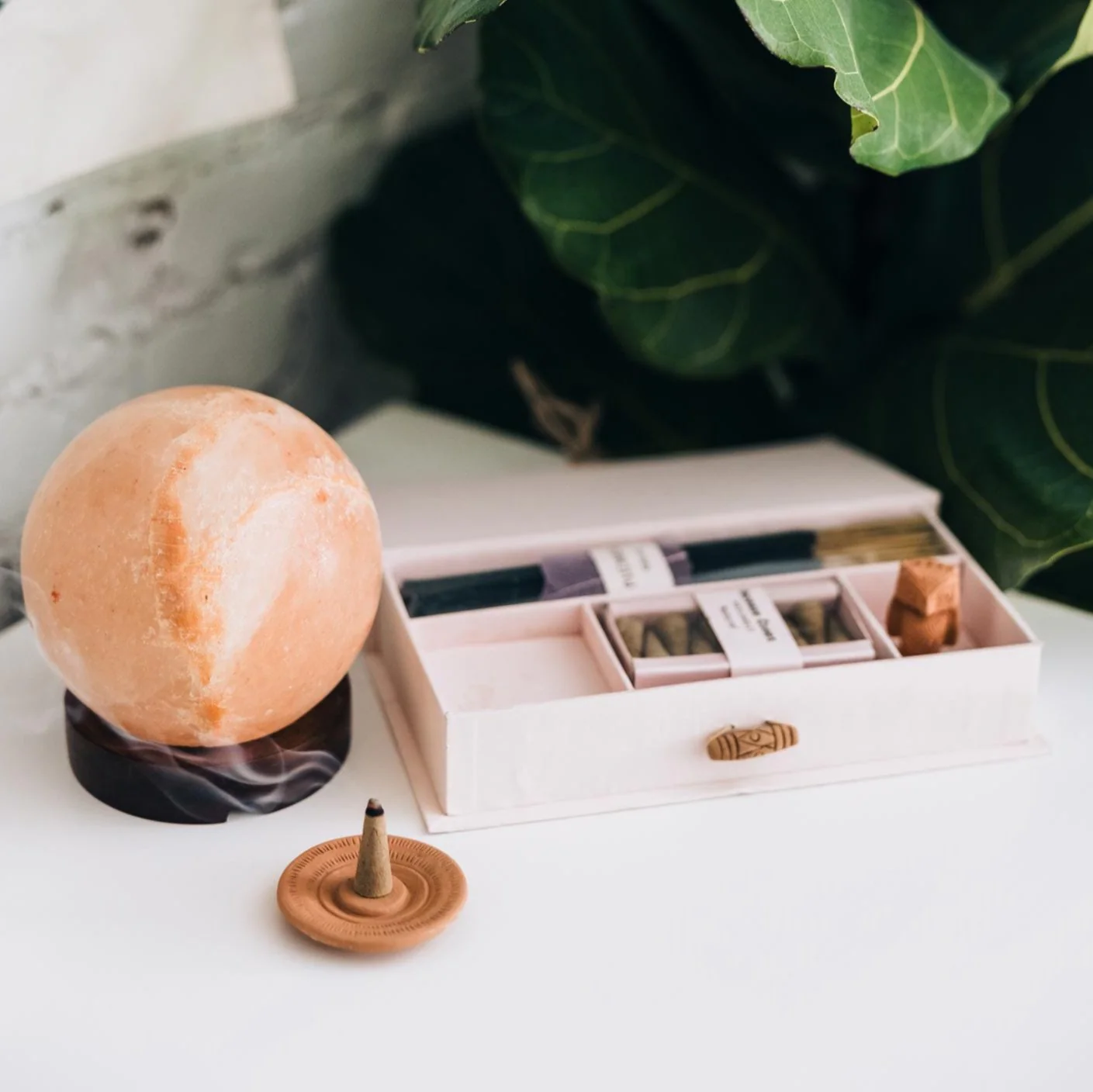 The Patchouli Incense Set is a handcrafted gift set made exclusively for Ten Thousand Villages in the Silence workshop in India—an artisan group where people with disabilities, especially the hearing impaired, learn sign language, craft skills and are offered employment. The set includes various patchouli incenses, a terracotta plate and a wise owl incense holder. All are arranged beautifully in a pale pink box with hinged lid and terracotta button closure.