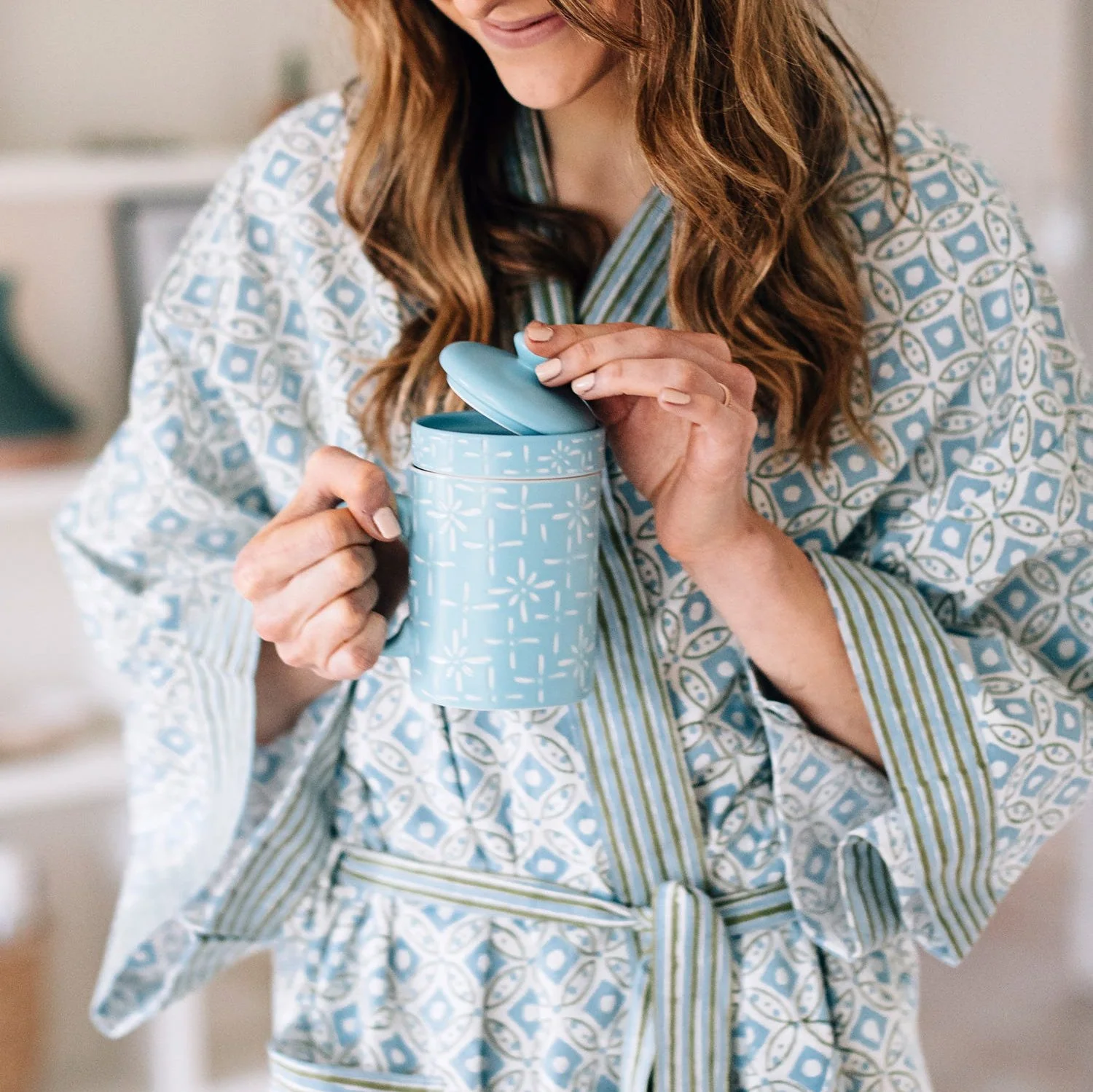 Kick back in a lightweight cotton robe from Aravali, in Jaipur, India. Block printing is a labor-intensive method of hand-printing fabric. The artisans imprint the cloth with a wooden block featuring a hand carved design. The printer moves from left to right, dipping the design block into the dye and stamping it onto the cloth. This is repeated to cover the entire cloth with the intended design and colors. Each block has a guide or registration point to match both designs and colors.