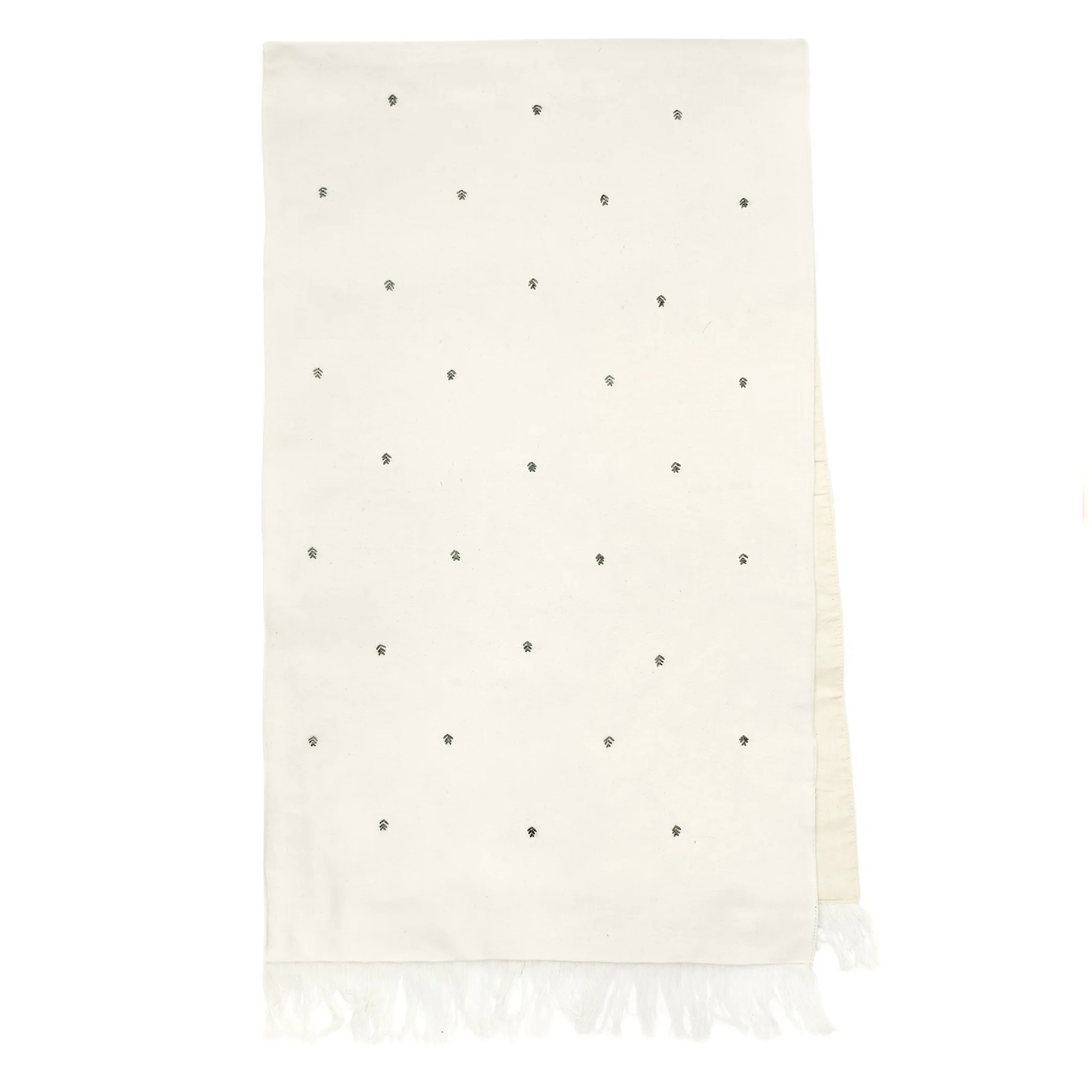 Generously sized at 18"W x 59"L, this beautiful table runner features a soft, hand-loomed cotton base adorned with delicately hand-embroidered dusty green leaves, each stitch a testament to the artisan’s skill and patience. Handwoven on traditional looms, this piece reflects a heritage of craftsmanship passed down through generations. The elegant, versatile design complements any style and is perfect for year-round use. Handcrafted in Bangladesh.