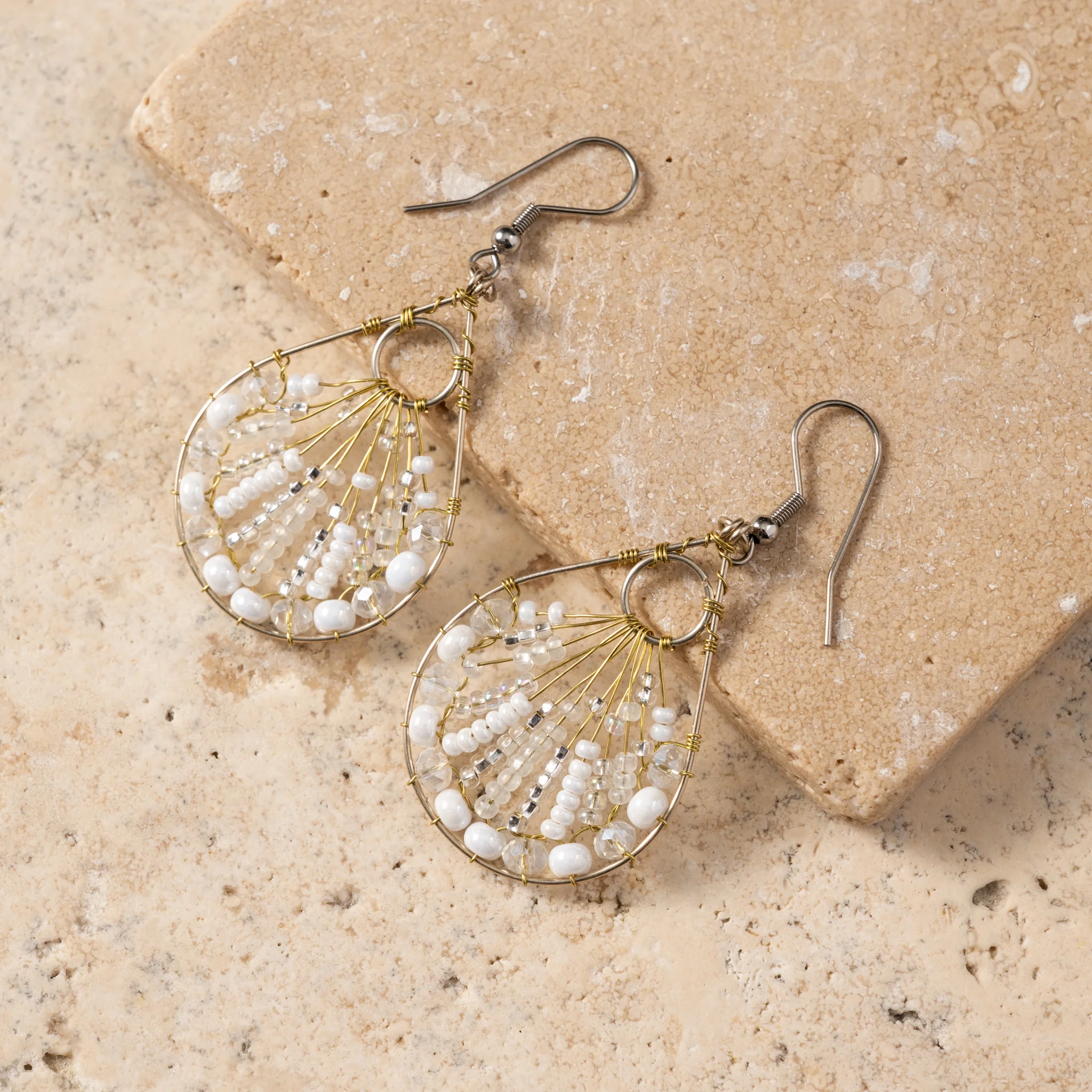 Silver teardrop frames are hand-wrapped with golden wire, radiating outward with white and clear glass beads that catch the light from every angle. A delicate circle at the top balances the design, creating a refined silhouette that’s both versatile and striking. Finished with stainless steel hooks for comfort and durability, A Ten Thousand Villages Exclusive handcrafted in Guatemala by the artisans of Creaciones Chonita, an organization that contributes to the integral development of Guatemalan society by promoting equity and providing employment to the neediest families.
